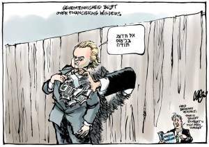 Op de cartoon van Collignon is een arm te zien die een pak geld in de binnenzak van PVV-leider Geert Wilders stopt. In een tekstballon bedankt Wilders de gever in het Hebreeuws. Hero Brinkman, rechtsonder in beeld vertaalt: ‘Dank u beleefd en maakt u zich geen zorgen.’ Boven de cartoon staat de tekst: ‘geheimzinnigheid blijft over financiering Wilders’.