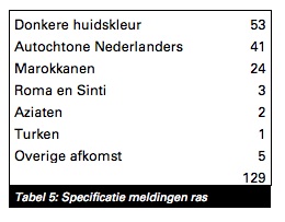 Van de 129 meldingen die MiND ontving over discriminerende uitingen op grond van ras, had ruim 40 procent betrekking op discriminatie van personen met een donkere huidskleur, waarvan een deel voortkwam uit de ‘Zwarte Piet-discussie’ die eind vorig jaar in Nederland plaatsvond. Verder kreeg MiND 41 meldingen over discriminatie van autochtone Nederlanders die grotendeels een enkele uiting betroffen, namelijk een specifiek Twitter-account waarin opgeroepen werd tot vergassing van Nederlanders. Bijna 20 procent van de meldingen over rassendiscriminatie had betrekking op uitingen over Marokkanen.