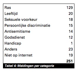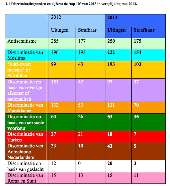 Na antisemitisme wordt bij het MDI het vaakste melding gemaakt van discriminatie van moslims, gevolgd door ‘anti-zwart racisme of afrofobie’. In totaal kreeg het MDI in 2013 809 meldingen binnen, waarvan er in 489 door het MDI als strafbaar werden beoordeeld. Zie voor meer cijfers de kleurrijke tabel van het CIDI hieronder.