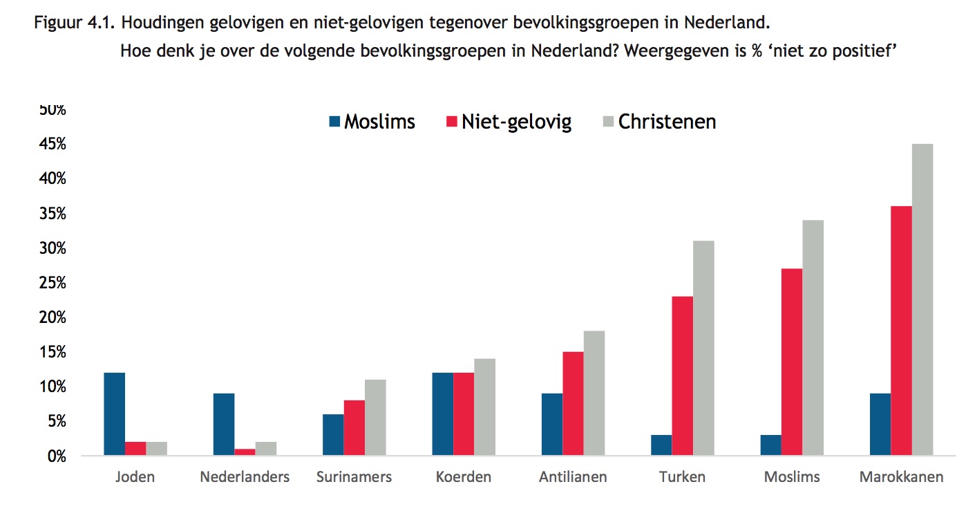 Uit het onderzoek komt ook naar voren dat christelijke en niet-gelovige jongeren veel vaker niet zo positief denken over Nederlandse moslims dan islamitische jongeren denken over Joden in Nederland.