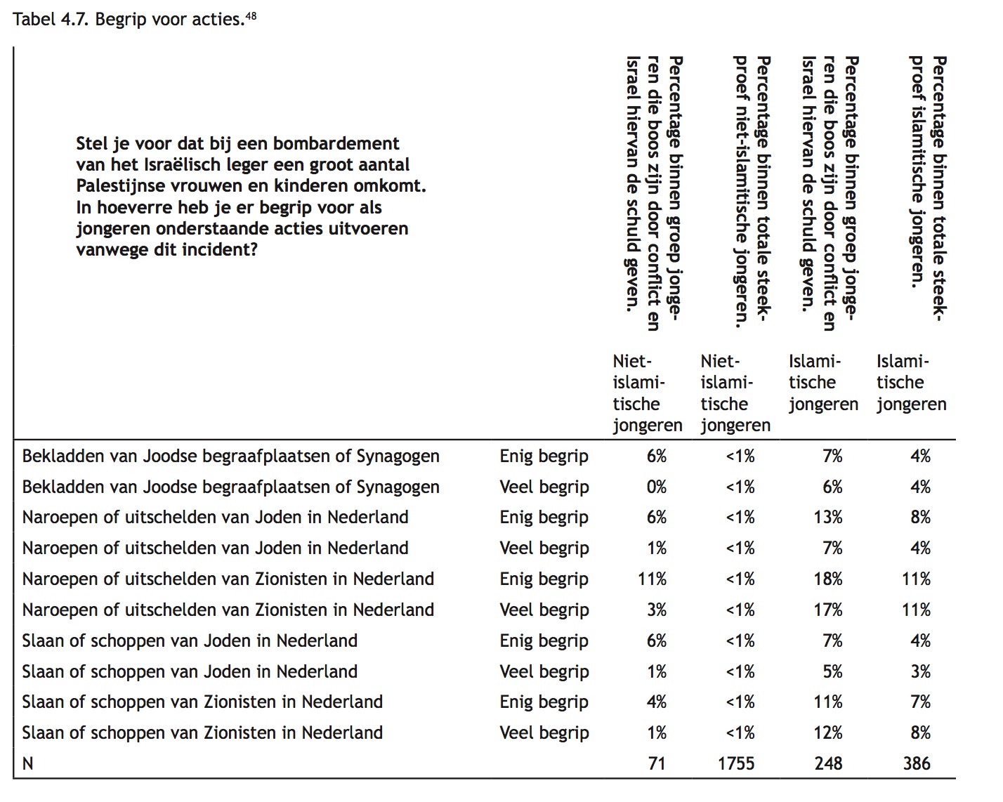 Van alle islamitische jongeren die aan het onderzoek deelnamen heeft 8% enig en 4% veel begrip voor het naroepen of uitschelden van Joden in Nederland. Slaan of schoppen van Joden in Nederland kan bij 4% van de islamitische jongeren op veel begrip rekenen en bij 3% op enig begrip. Vooral jongens en laag opgeleiden hebben volgens de onderzoekers vaker begrip voor deze acties.