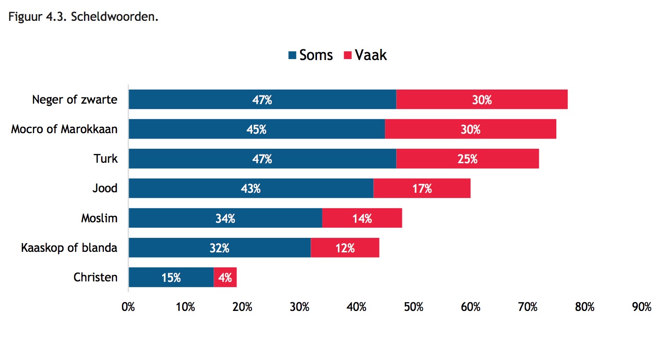 Uit het onderzoek blijkt dat jongeren ‘mocro/Marokkaan’ en ‘neger/zwarte’ het vaakst als scheldwoord horen. Van de jongeren zegt 30 procent ‘mocro/Marokkaan’ en ‘neger/zwarte’ vaak te horen als scheldwoord, en respectievelijk 45 en 47 procent soms. Het woord ‘Jood’ wordt door 17 procent van de jongeren vaak gehoord als scheldwoord, en door 43 procent van de jongeren soms gehoord als scheldwoord. Jongeren verklaren tegen de onderzoekers dat het woord ‘Jood’ vooral wordt gebruikt ‘onderling, voor de lol, om grappen te maken’. Ook wordt het woord ‘jood’ regelmatig gebruikt in ruzies en conflicten, net zoals in discussies op inter- net en tegen de politie.