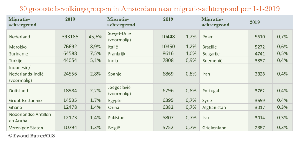Het overgrote merendeel van de Amsterdammers, ruim 45%, heeft geen migratieachtergrond. Ongeveer één op de elf Amsterdammers heeft een Marokkaanse migratie-achtergrond (minimaal één ouder die in Marokko geboren is). Hieronder de 30 grootste bevolkingsgroepen. (Bron)