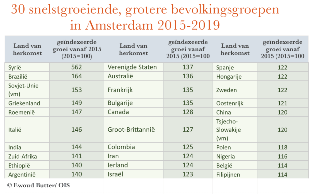Uit onderstaande tabel van OIS blijkt dat de groei de afgelopen jaren ook niet komt van immigratie van de grootste bevolkingsgroepen in Amsterdam: voor Amsterdammers zonder migratieachtergrond, maar ook in mindere mate voor Surinaamse en Marokkaanse Amsterdammers geldt al een paar jaar dat de groep die de stad verlaat groter is dan de groep die zich in de stad vestigt. Bij Turkse Amsterdammers was ook enige tijd sprake van een negtief migratiesaldo, maar door de politieke spanningen in dat land is dat de afgelopen jaren veranderd.