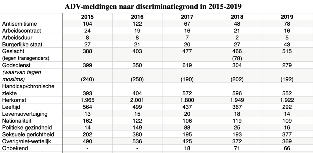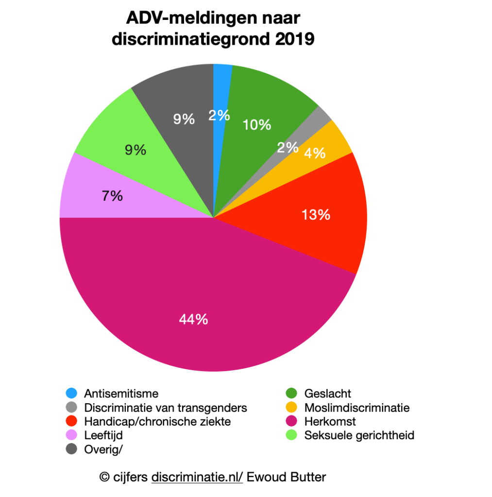 Bij de ADV’s werd verder relatief vaak melding gedaan van discriminatie op de gronden handicap (12%) en geslacht (12%), hieronder uitgesplitst in discriminatie van transgenders (2%) en overig geslacht (10%). In vergelijking met vorig jaar nam het aantal meldingen van moslimdiscriminatie iets af (van 5% naar 4%) en het aandeel antisemitisme iets toe (van 1% naar 2%). Wat opvalt is het relatief hoge aantal meldingen van discriminatie op grond van seksuele gerichtheid ( van 4 naar 9 procent). Dit zijn waarschijnlijk meldingen over de Nashville-verklaring en meldingen over het mogelijkerwijs niet vergoeden van vruchtbaarheidsbehandelingen voor lesbische vrouwen.