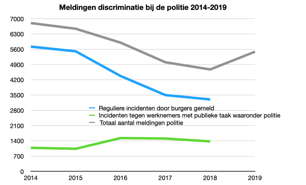 De stijging bij de politie is opmerkelijk, zeker omdat er in de periode 2014-2018 nog sprake was van een afname met maar liefst 40% (!) van het aantal meldingen. Voor deze toename van het aantal incidenten in 2019 bij de politie wordt in Discriminatiecijfers 2019 geen duidelijke verklaring gegeven.