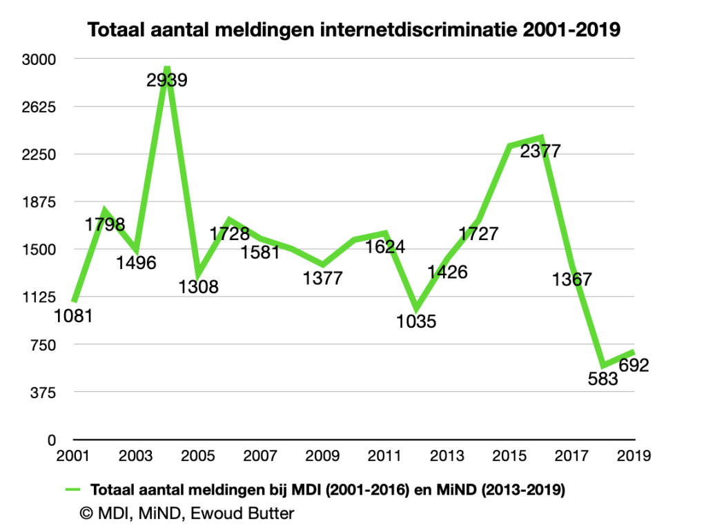 In de jaren daarvoor was subsidie gegeven aan het Meldpunt Discriminatie Internet (MDI) dat vanaf de eeuwwisseling lange tijd het enige meldpunt voor online discriminatie was. Het MDI ging na het stopzetten van de subsidie nog drie jaar door met het registreren van incidenten en kreeg in 2014 en 2015 meer meldingen dan MiND. Vanaf 2017 is er nog maar één meldpunt, MiND, dat in 2018 een historisch laag aantal meldingen kreeg en dit jaar weer iets steeg. Het aantal meldingen, ongeveer 2 per dag, blijft uitzonderlijk laag voor het open riool dat internet nog steeds is. Hieronder een overzicht dat ik maakte op grond van de jaarrapporten van het MDI en MiND.