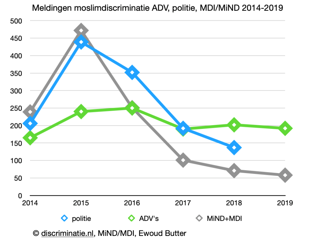 In de cijfers van de registratie-instanties was dit echter geheel niet zichtbaar, omdat moslimdiscriminatie in Nederland niet apart werd geregistreerd. Uitzondering hierop was het voormalige Meldpunt Discriminatie Internet (MDI) dat moslimdiscriminatie vanaf 2001 wel registreerde. Dat veranderde rond 2014, 2015. Op aandringen van maatschappelijke organisaties, wetenschappers, blogs en politieke partijen, voornamelijk linkse politici met een migratieachtergrond van PvdA en GroenLinks (en later DENK) werd moslimdiscriminatie vanaf die tijd apart geregistreerd.