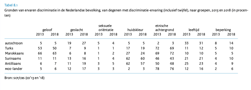 Onderstaande tabel uit het SCP-rapport geeft weer in welke mate de discriminatiegronden door groepen met verschillende etnische achtergronden worden genoemd.