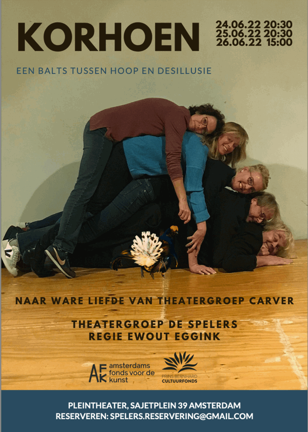 Merel. Frank. Bob. Conny. Anna. Veertig plus. Alleen, maar niet eenzaam, echt niet! En toch…. Echte liefde vind je niet bij de Blokker, dus gaan ze samen op zoek naar een glimp, een gevoel, een kans op geluk. De dertiende productie van De Spelers, Korhoen, is een tragikomische balts tussen eigenwaarde en wanhoop, tussen hoop en desillusie.