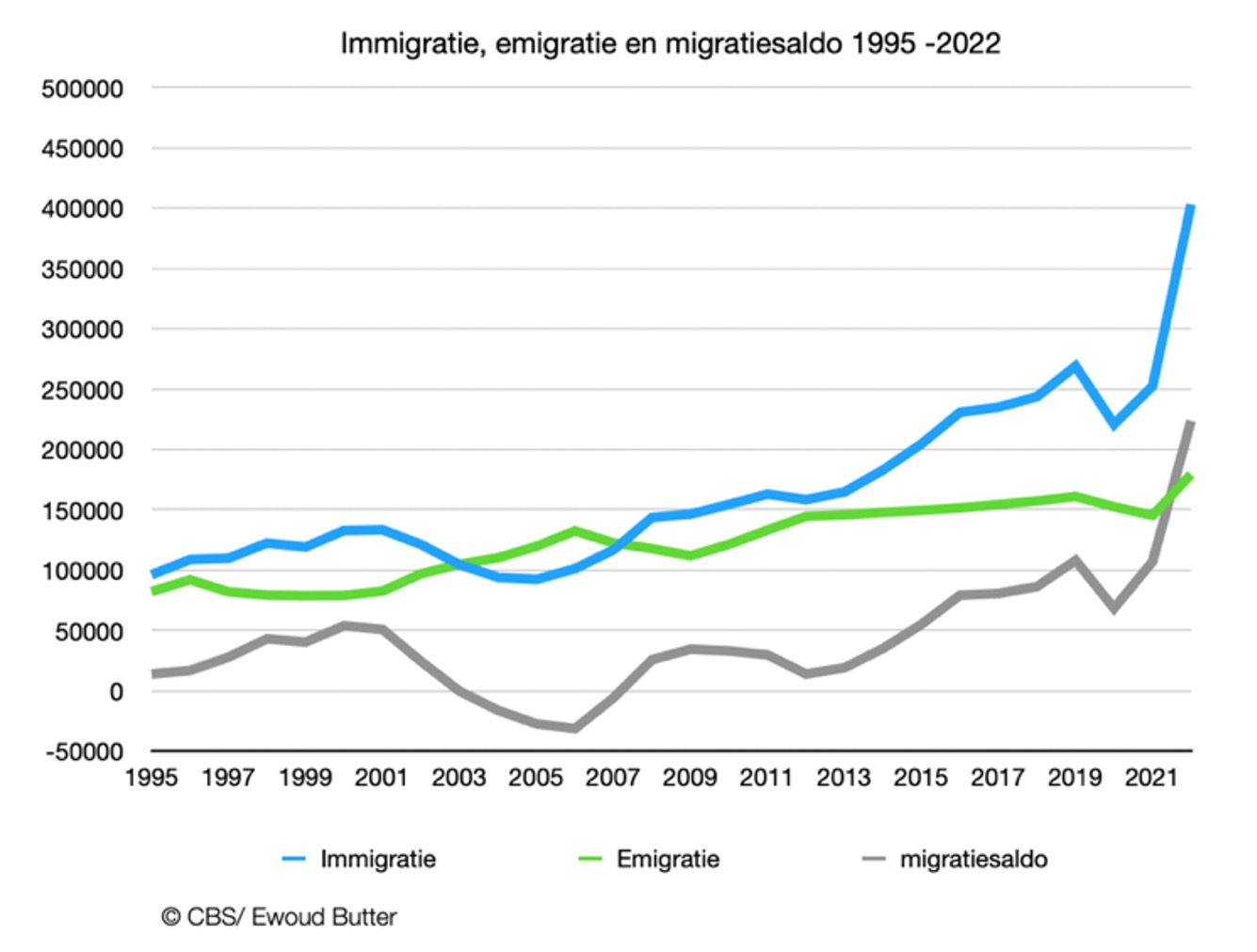 Nee, het waren er in 2022 veel meer dan in voorgaande jaren (zie het blauwe lijntje in de grafiek). Niet iedereen die naar Nederland komt, blijft hier ook. Een groot deel vertrekt na een aantal jaren weer. In 2022 emigreerden er meer mensen dan ooit uit Nederland: 179.000 (het groene lijntje). Omdat de immigratie sterker toenam dan de emigratie, was ook het migratiesaldo (de immigratie min de emigratie) met een kleine 224.000 personen (het grijze lijntje) hoger dan ooit.