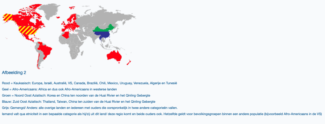 ‘Dit kaartje geeft aan dat mensen uit bijvoorbeeld Algerije, Tunesië, Brazilië, Chili en Israël onder de ‘Kaukasische’ categorie vallen, net als witte Europeanen, terwijl Afro-Amerikanen een aparte correctiefactor krijgen voor hun longfunctie. Dit is belachelijk. Het is duidelijk dat dit systeem geen wetenschappelijke basis heeft en dringend moet worden aangepast. Ik grap weleens dat Marokkanen zich als Algerijnen moeten identificeren voor eerlijke referentiewaarden.’