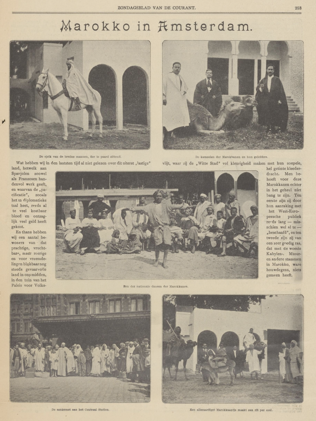 “Met de vandaag geopende manifestatie ‘Marokko in Amsterdam. De Witte Stad’ verandert de tuin van het Paleis voor Volksvlijt in een openluchtmuseum, vol “Oostersche vermakelijkheden en merkwaardigheden” . Er staan witte huisjes en een moskee van bordkarton. Nu en dan trekken er optochten van “heusche Bedoeienen” door de tuin, onder leiding van een sjeik. Ook zijn er derwisjen en slangenbezweerders. Naast de moskee is een soek, oftewel een overdekte markt, “waar pottenbakkers en vlechtwerkers hun ambacht toonen en waar eem aardig overzicht wordt gegeven van de kleinindustrieen van Afrika’s Noordkust” (Alg. Handelsblad). De moskee wordt ingewijd met het ritueel slachten van een schaap. Maar daar mag het grote publiek niet bij zijn. Wel een toezichthouder van het Gemeentelijk Abbatoir. Helaas wordt de oosterse illusie wel verstoord door het weer. Het is koud en het regent pijpestelen.”